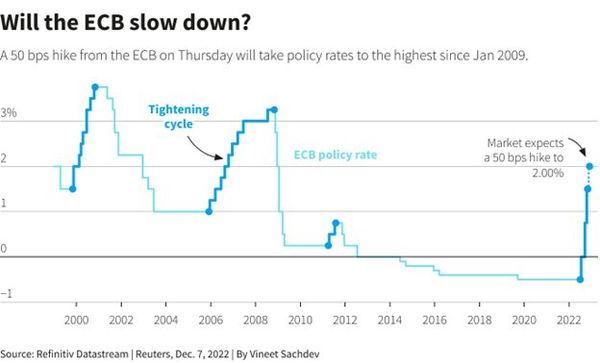 📍Пүрэв гарагт Европын төв банк бодлогын хүүгээ 50 суурь нэгжээр өсгөх төлөвтэй байгаа бөгөөд энэ нь 2009 оны нэгдүгээр сараас хойших хамгийн өндөр бодлогын хүү болохоор байна.