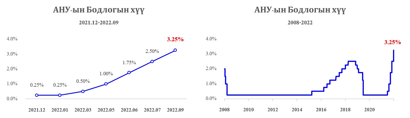 2022.09.22-ны өдөр АНУ-ын Холбооны Нөөцийн Банк (FED) бодлогын хүүгээ 0.75%-иар нэмэгдүүлж 3.25% болгох шийдвэр гаргалаа. 2022 он гарснаас хойш нийт 6 удаа бодлогын хүүгээ өсгөөд байгаа тус улсын хувьд энэ байдлаараа үргэлжилвэл оны сүүл гэхэд бодлогын хүү 4.4% хүрнэ гэж судлаачид дүгнэж байна.