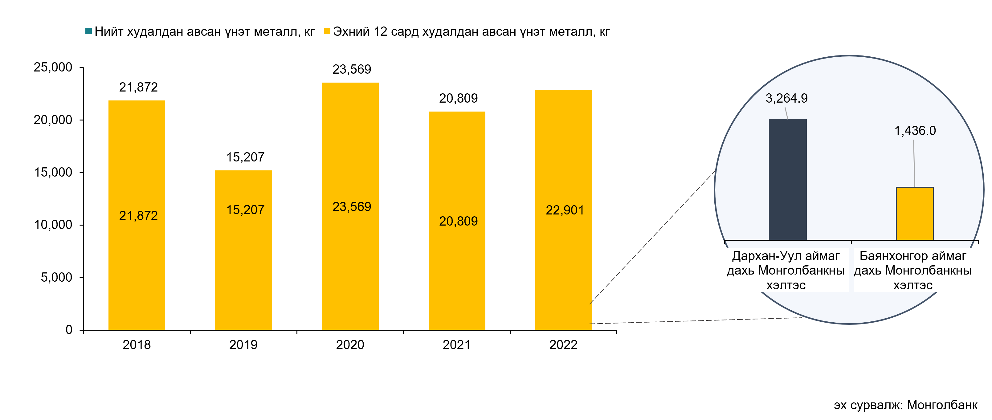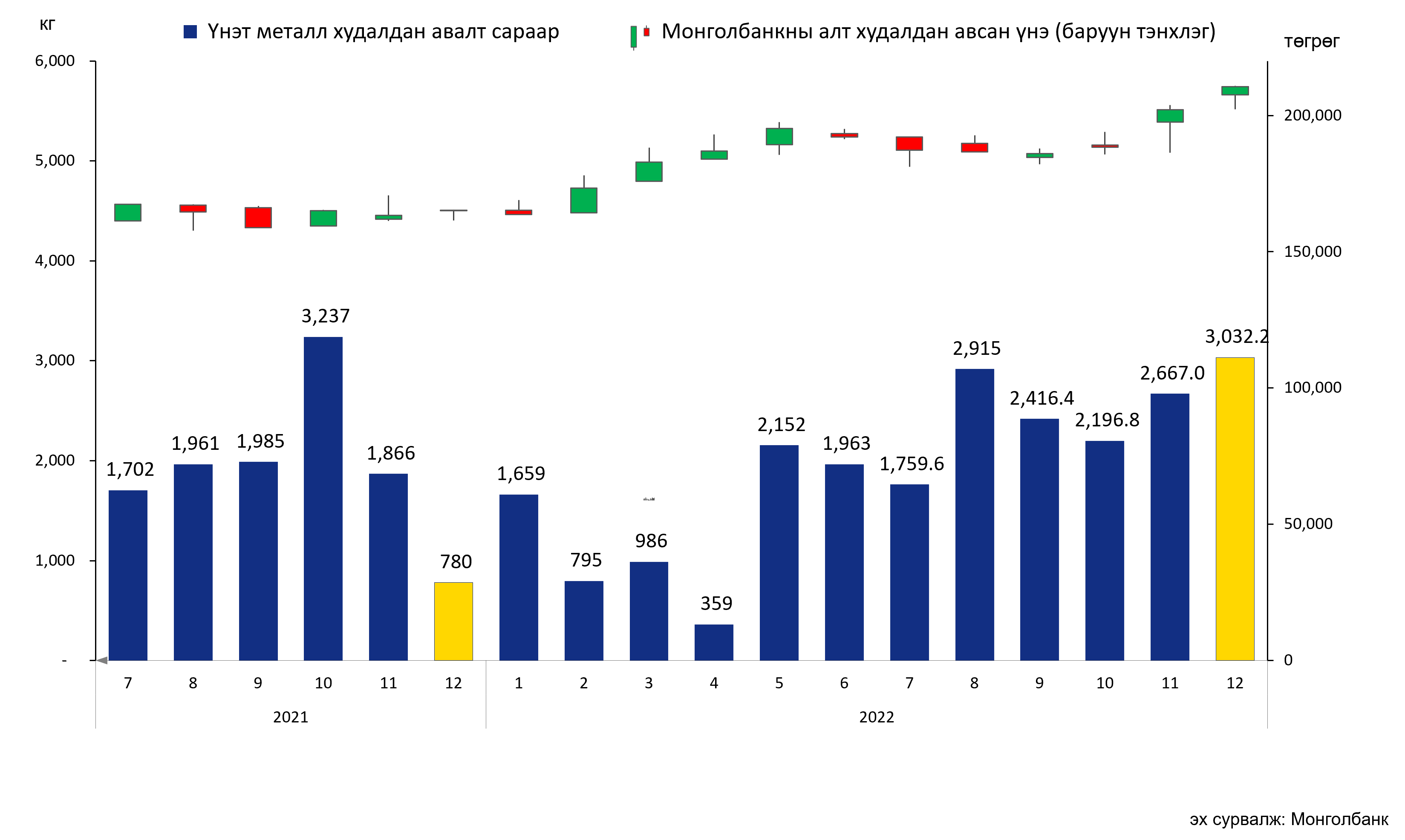 Монголбанк өнгөрсөн оны 12 дугаар сард 3,032.2 кг үнэт металл худалдан авч, оны эхнээс өссөн дүнгээр 22.9 тонн үнэт металл худалдан авсан байна. Энэ нь 2021 оны мөн үетэй харьцуулахад 10 хувиар өссөн үзүүлэлт болжээ.