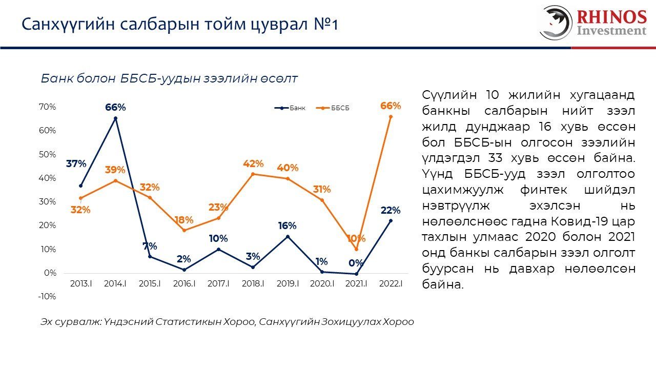 - Сүүлийн 10 жилийн хугацаанд банкны салбарын нийт зээл жилд дунджаар 16 хувь өссөн бол ББСБ-ын олгосон зээлийн үлдэгдэл 33 хувь өссөн байна. Үүнд ББСБ-ууд зээл олголтоо цахимжуулж, финтек шийдэл нэвтрүүлж эхэлсэн нь нөлөөлснөөс гадна Ковид-19 цар тахлын улмаас 2020 болон 2021 онд банкны салбарын зээл олголт буурсан нь давхар нөлөөлсөн байна.